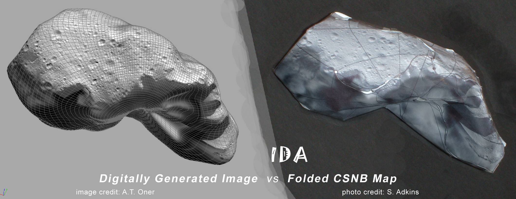 Yes, there is an asteroid named Ida, and it is an extravagant shape, so extravagant that, thanks to Tayfun Oner’s computer wizardry, you’ll benefit from having some ribs to pack inside the folded object, helping hold its shape. Cut this out and get in touch with Ida.
