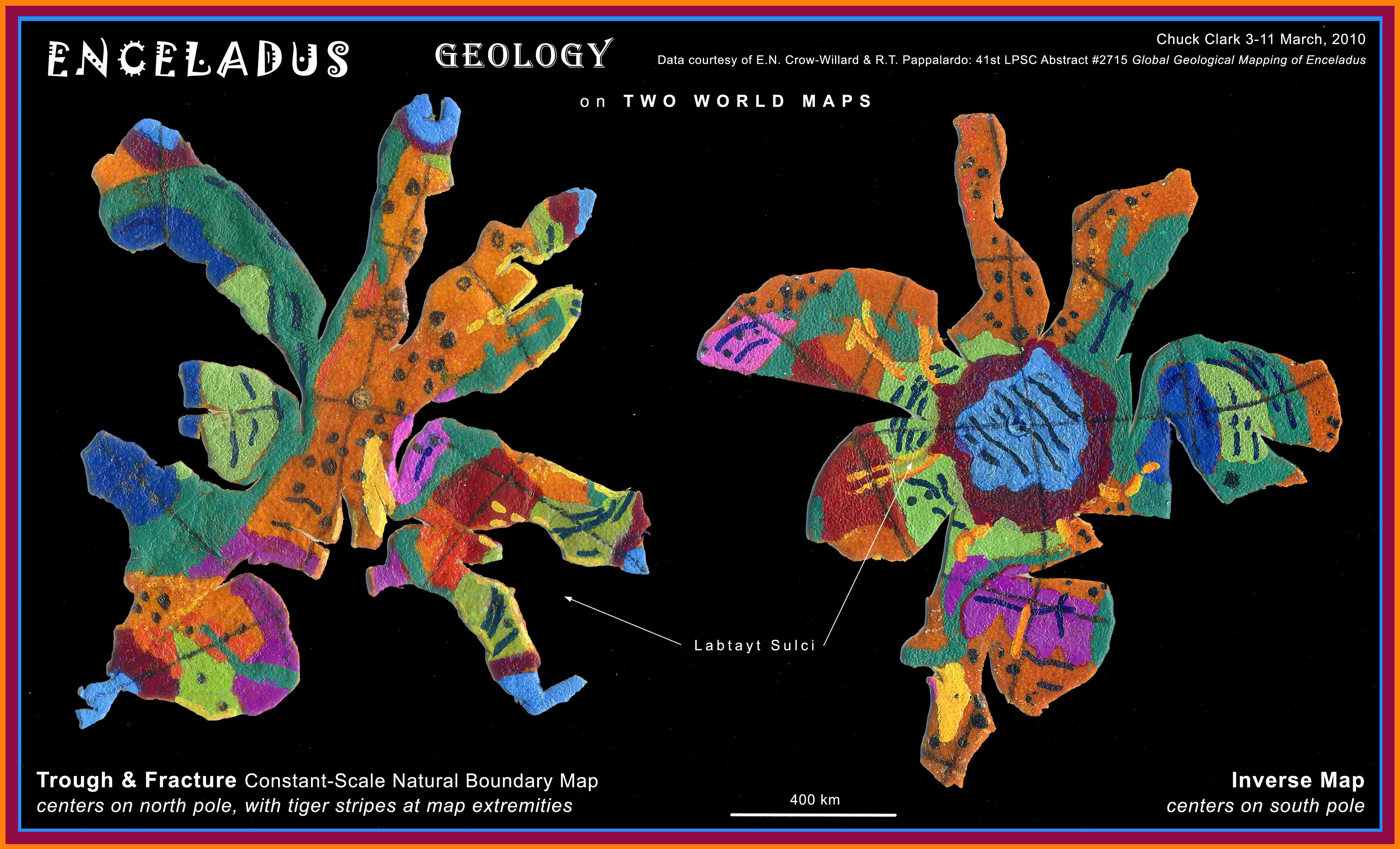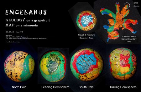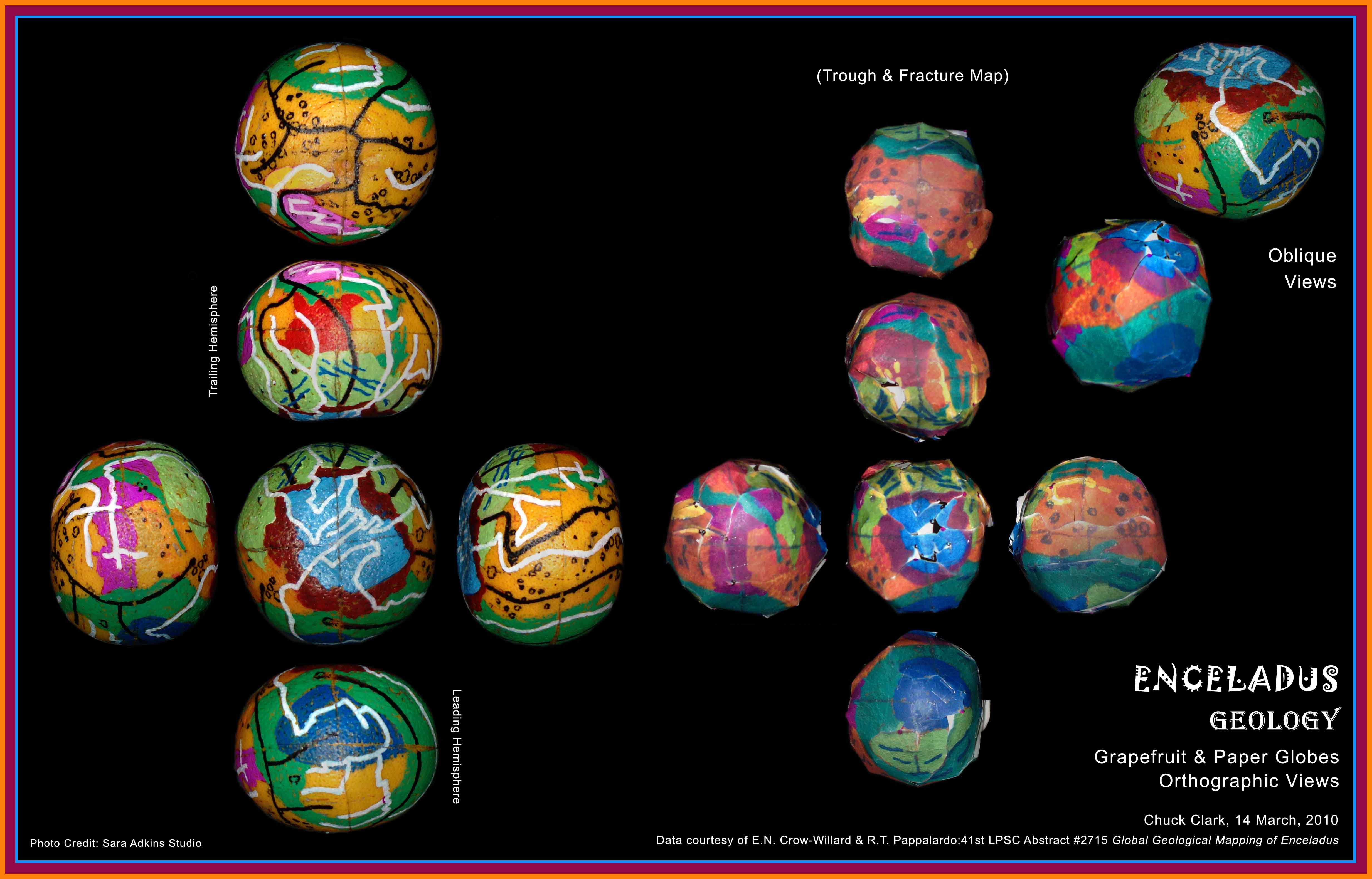 But these are sketch maps, prepared using citrus fruit during and following the 2010 Lunar and Planetary Science conference. Citrus peel, I learn, stretches when peeled, so these maps will not fold up very well. (I’ll post later some pics of the folding results; some seam slices into the field of the maps were needed). The map in the “globe” sheet is corrected and improved on the map sheet. Point is, there is now a global geological organization to the surface of Enceladus. Over next year, keep checking in for mapping updates; we’ll see if constant-scale natural boundary mapping can help identify global patterns of tectonic activity. And at the very least, we’ll have an economical way to make globes of Enceladus.