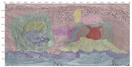 Enceladus is the sixth-largest moon of Saturn, discovered in 1789 by William Herschel, and now, courtesy of the Cassini mission, known to have tectonic activity “in the large.” (Well-spread across its surface.) Here’s the new geology map,