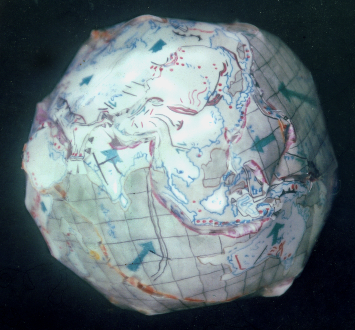 I say that in good fun. I actually enjoyed the challenge and possibilities of assembling this map, which uses as the map boundary the entire set of earth’s active tectonic lines (minus a few prunings of the topological tree). And I’ve only done one, and used too much tape, which limits the folded globe’s responsiveness to touch. But, like I say, the possibilities are enchanting.